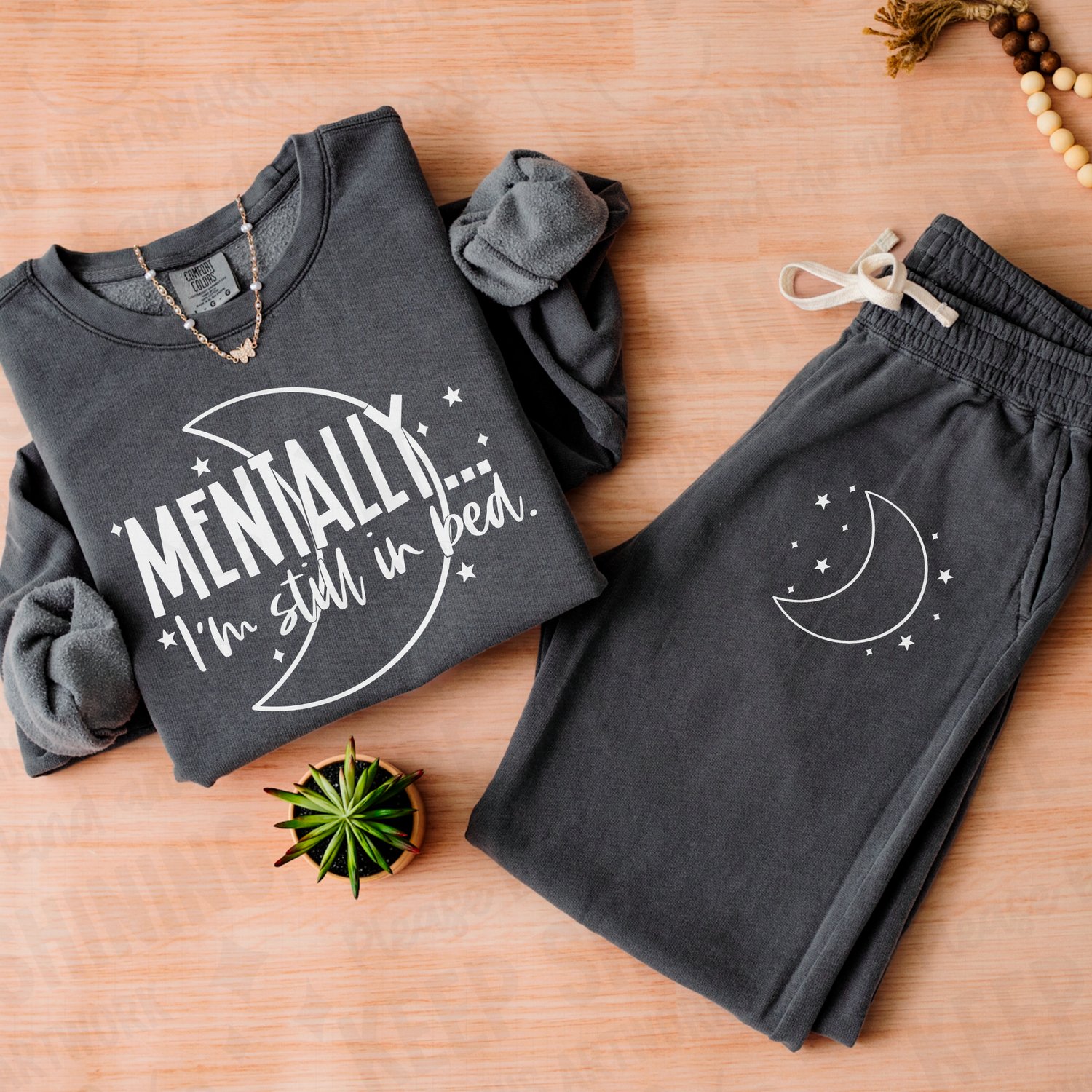 This ultra-soft sweatshirt features the playful phrase "MENTALLY... I'm still in bed." in bold white lettering. The text is surrounded by a whimsical crescent moon and stars design, perfectly capturing that dreamy, sleepy state of mind.