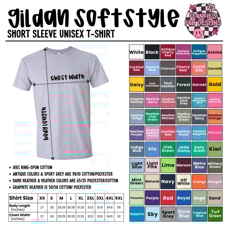 Select your shirt color using the chart below and include your choice in the note section at checkout.
