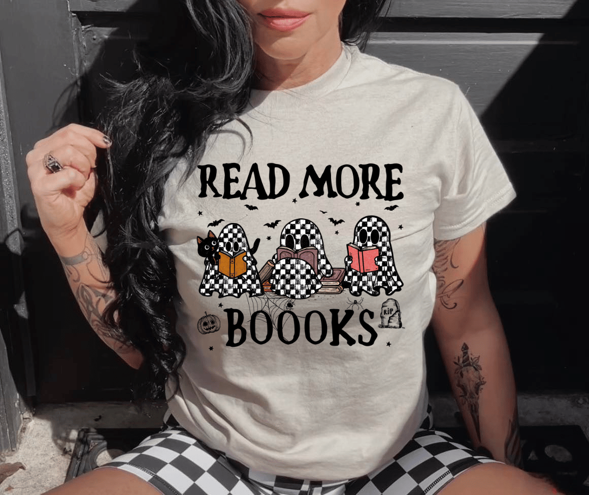 Our exclusive "Read More Boooks" crewneck is the perfect addition to any bookworm's wardrobe. It features a charmingly cute and spooky checkered ghost design, with friendly ghosts relaxing and reading, alongside the classic literary motto. It’s the ideal way to show off your love for reading while embracing the magic of fall.