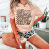 - Trendy Design: The groovy layered text, cool checkerboard accents, and neutral color palette give this shirt a modern, retro aesthetic that's currently trending.