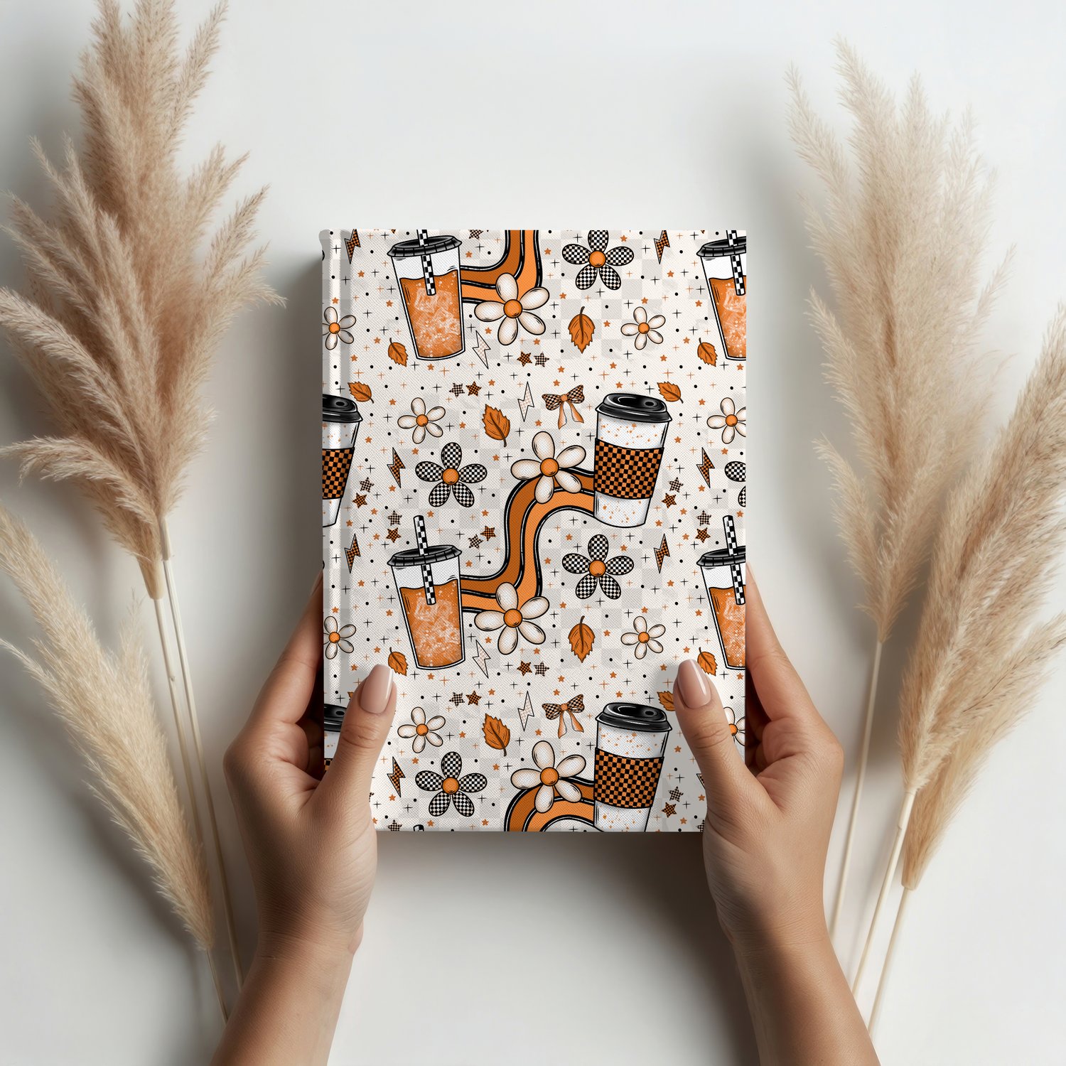 Indulge in the cozy charm of autumn with our "Autumnal Brews" Journal. This hardcover notebook is a delightful blend of retro flair and fall favorites, perfect for capturing your thoughts, dreams, and daily plans. The enchanting design features a whimsical pattern of iced coffee cups with checkered sleeves, groovy floral blooms, and scattered autumn leaves.